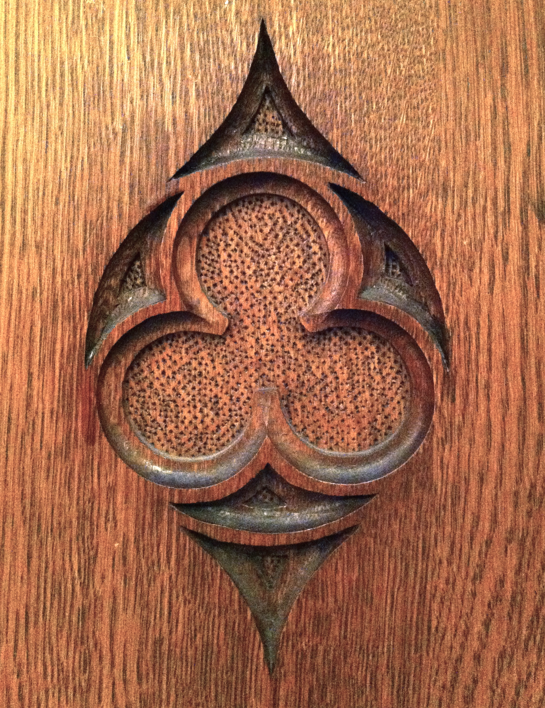 Finding the trinity among God’s people (in this case, carved in the end of an oak pew)