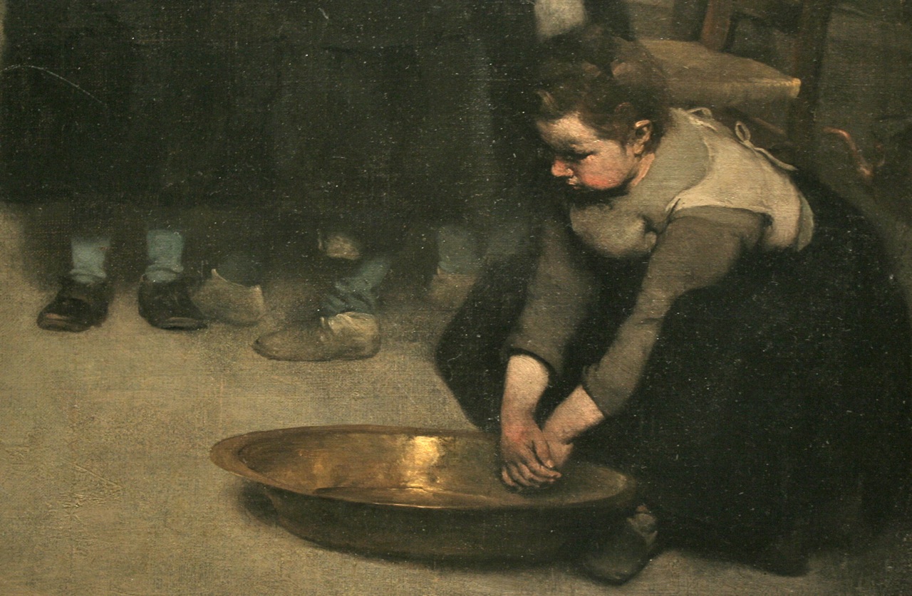 So the painting is perhaps as stark and plain and grey as the lives of those it depicts, though we should not assume too much from the painting. But what really strikes me about the painting, as was also pointed out by the description, is the copper wash basin: “The painting, executed in subtle tones of grey and black, is highlighted by a burnished copper pan.” It is a lovely and highly realistic detail there in the corner of the painting – it is warm and bright and brassy all at the same time. If there is a Chihuly moment in this painting, the copper pan is it: