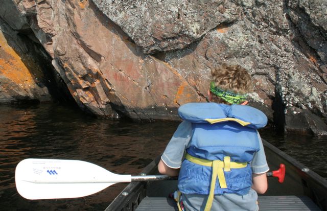 It is an astonishingly deep lake for its relatively small size – 145 meters at its deepest point. It goes pretty much straight down on each side. A second defining feature of the lake is that along one kilometer of its shoreline there is a massive 100-meter cliff or escarpment – that part of the shoreline is known as Mazinaw Rock. Here’s a picture that gives a sense of the Rock – with Becky and the girls in the canoe.Now it’s true that if you have spent any time living in or near the Rocky Mountains of western Canada, this cliff may not strike you as impressive. But in the context of Ontario’s geography, it is a remarkable lake and Mazinaw Rock is a pretty amazing formation.