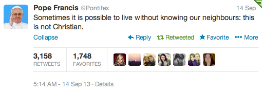 One of the things the proverbs do is to raise questions for us – questions about our behaviour, and the likely responses of others. And this particular proverb helps us to realize that dealing with neighbours mean’s not going out of your way to be an annoyance to them. But even so, this doesn’t mean that the book of Proverbs lets us hold our neighbour at a distance – far from it. I follow Pope Francis on Twitter and yesterday he tweeted words that fit much more closely with what the Proverbs say. “Sometimes it is possible to live without knowing our neighbours. This is not Christian.”